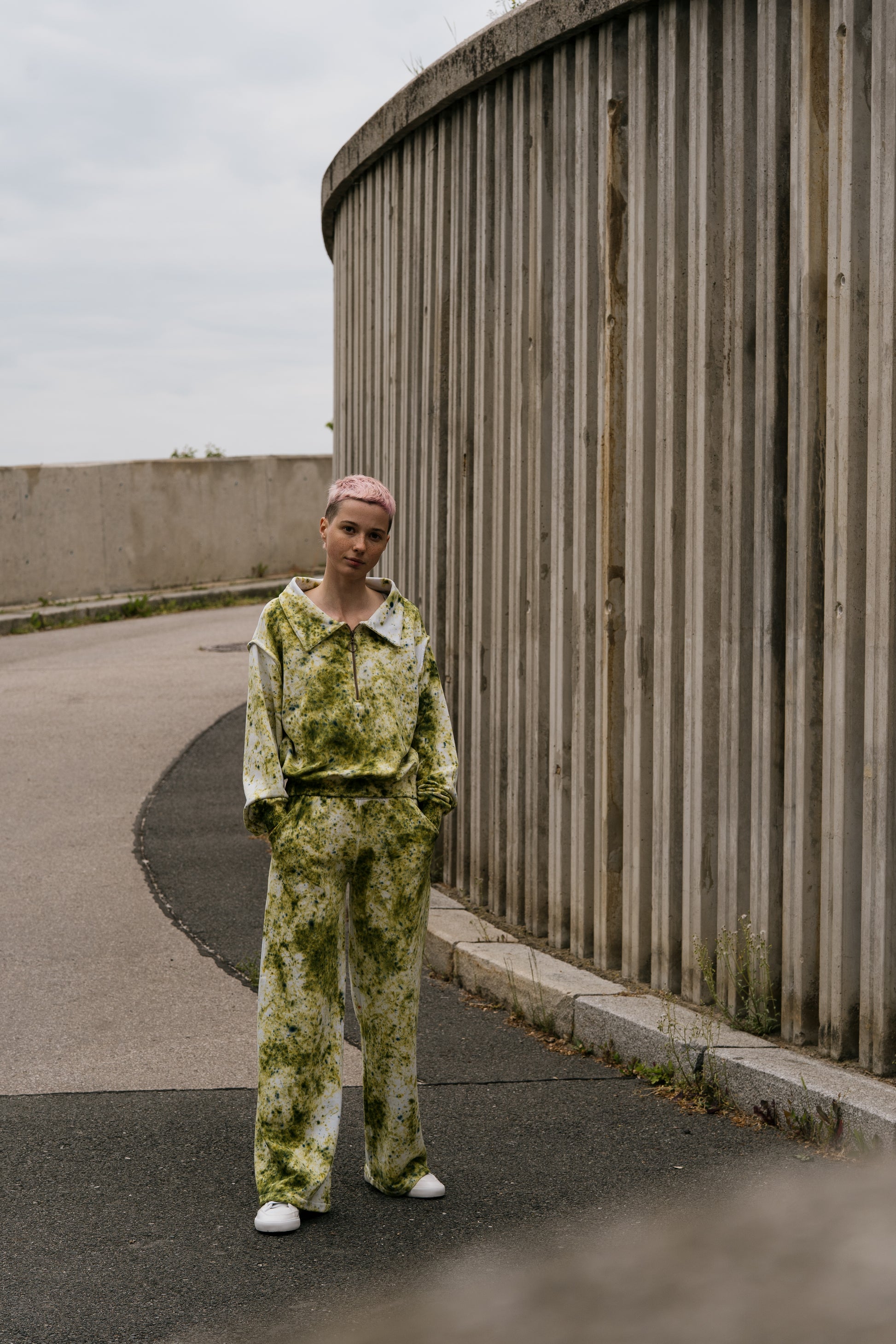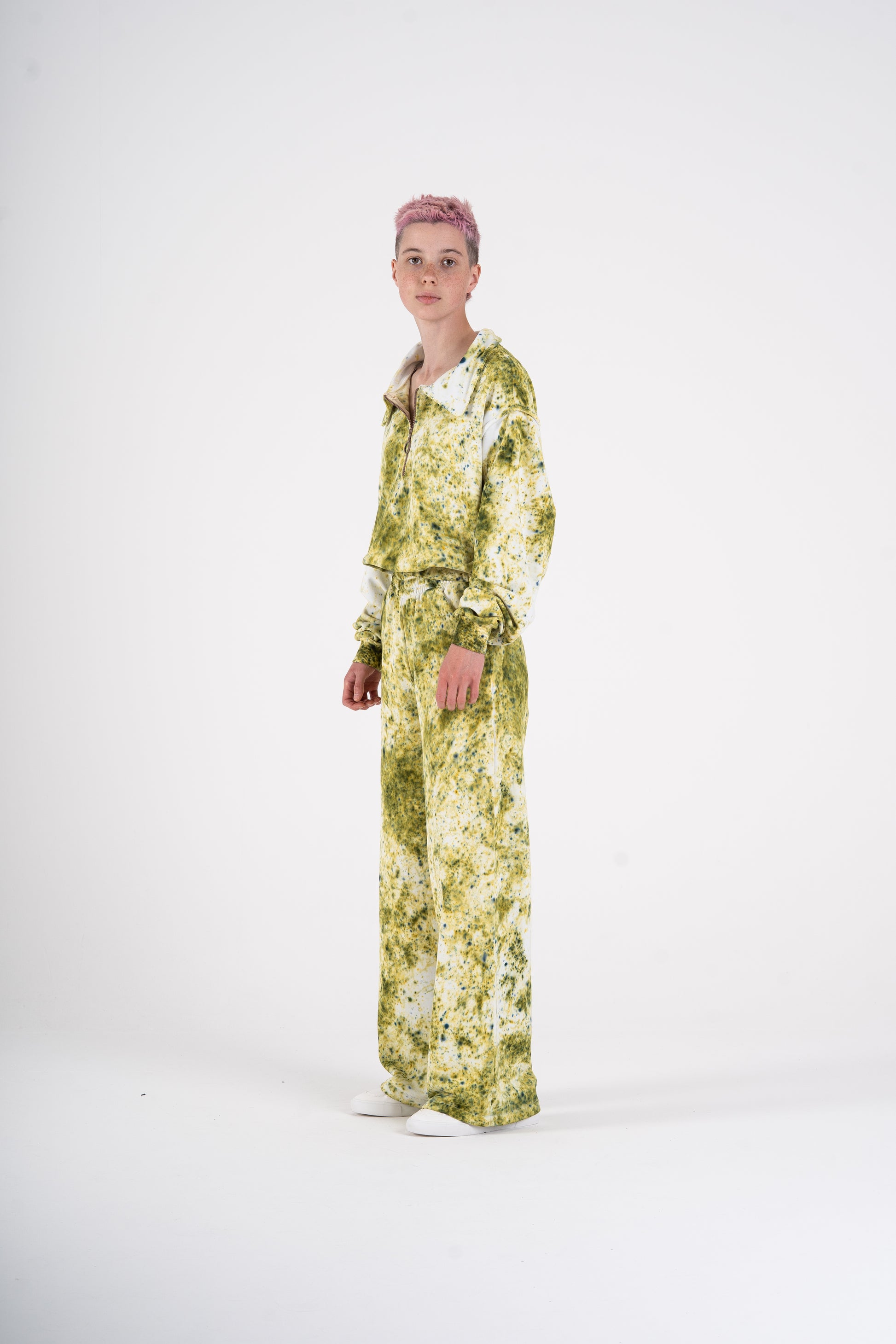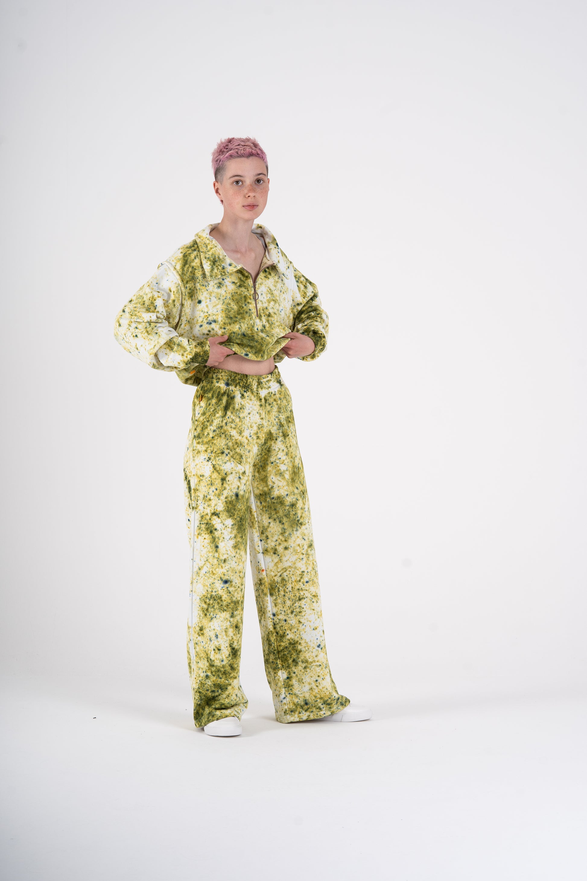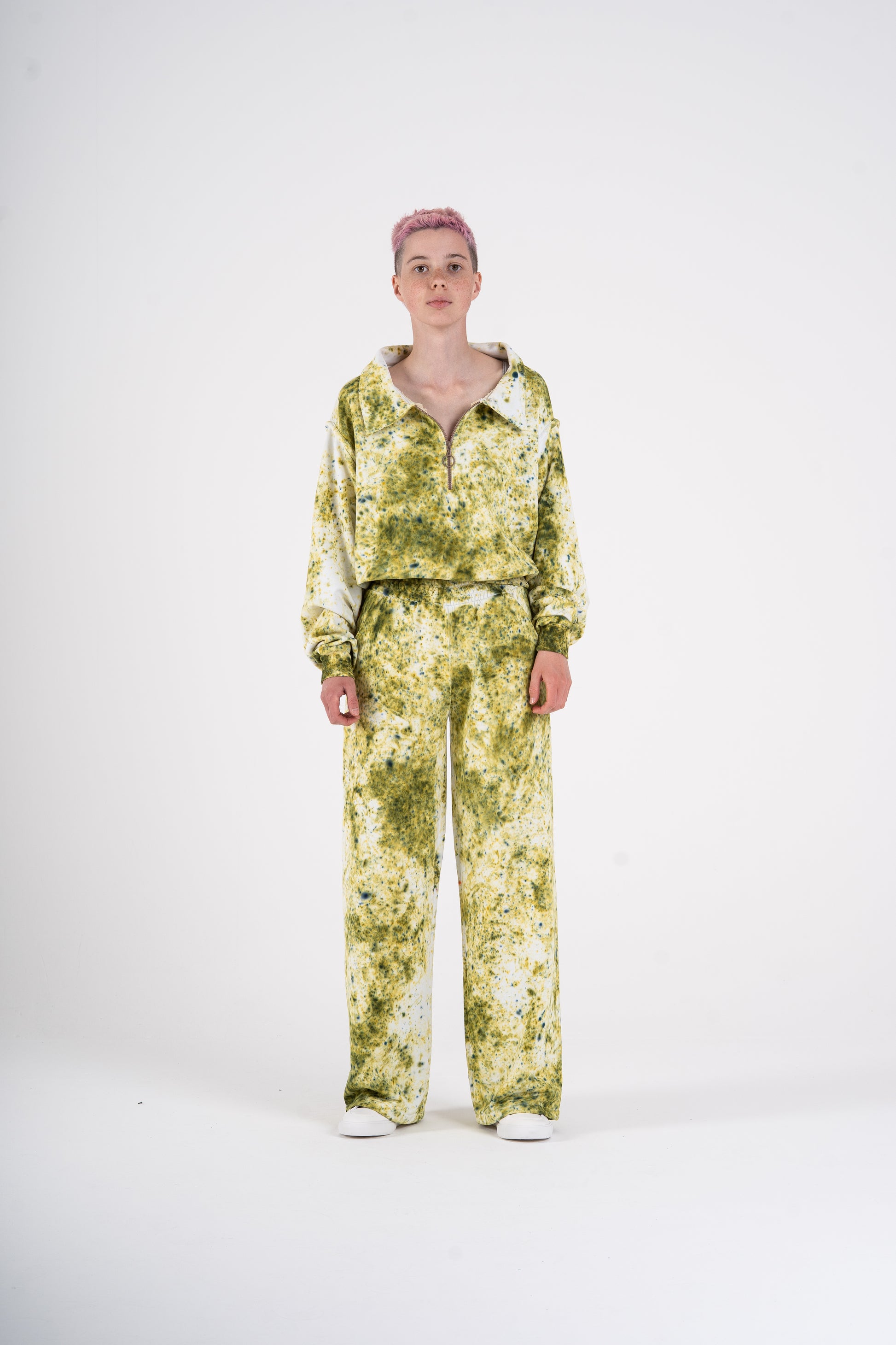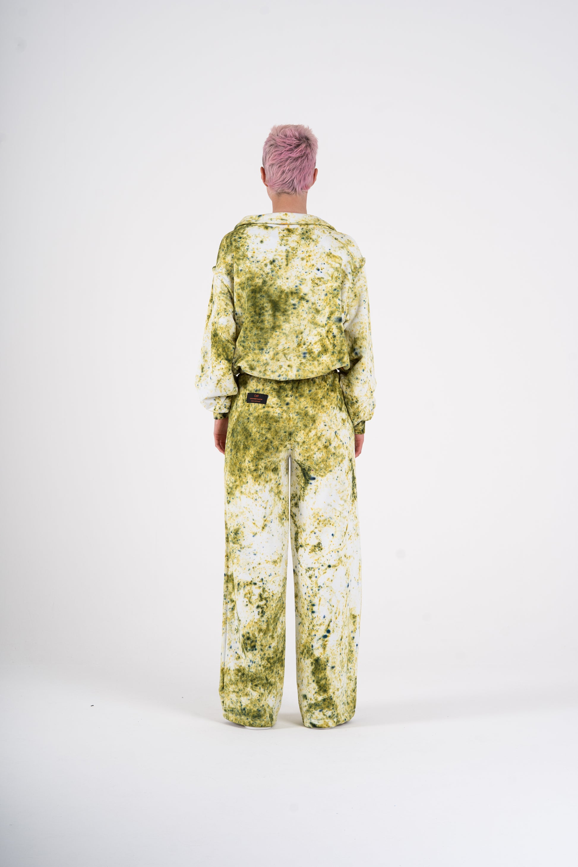 Tahle tepláková souprava má duši sedmdesátek – volnější střih, lehce spadlá ramena, pružné lemy a ikonický límec, který posouvá celý look na úroveň oldschool elegance. Každý kus barvím ručně, takže žádná teplákovka není stejná. Odstíny mají hloubku, patinu, život. V kombinaci s měkkým, těžším úpletem je to komplet, který má styl i pohodlí.