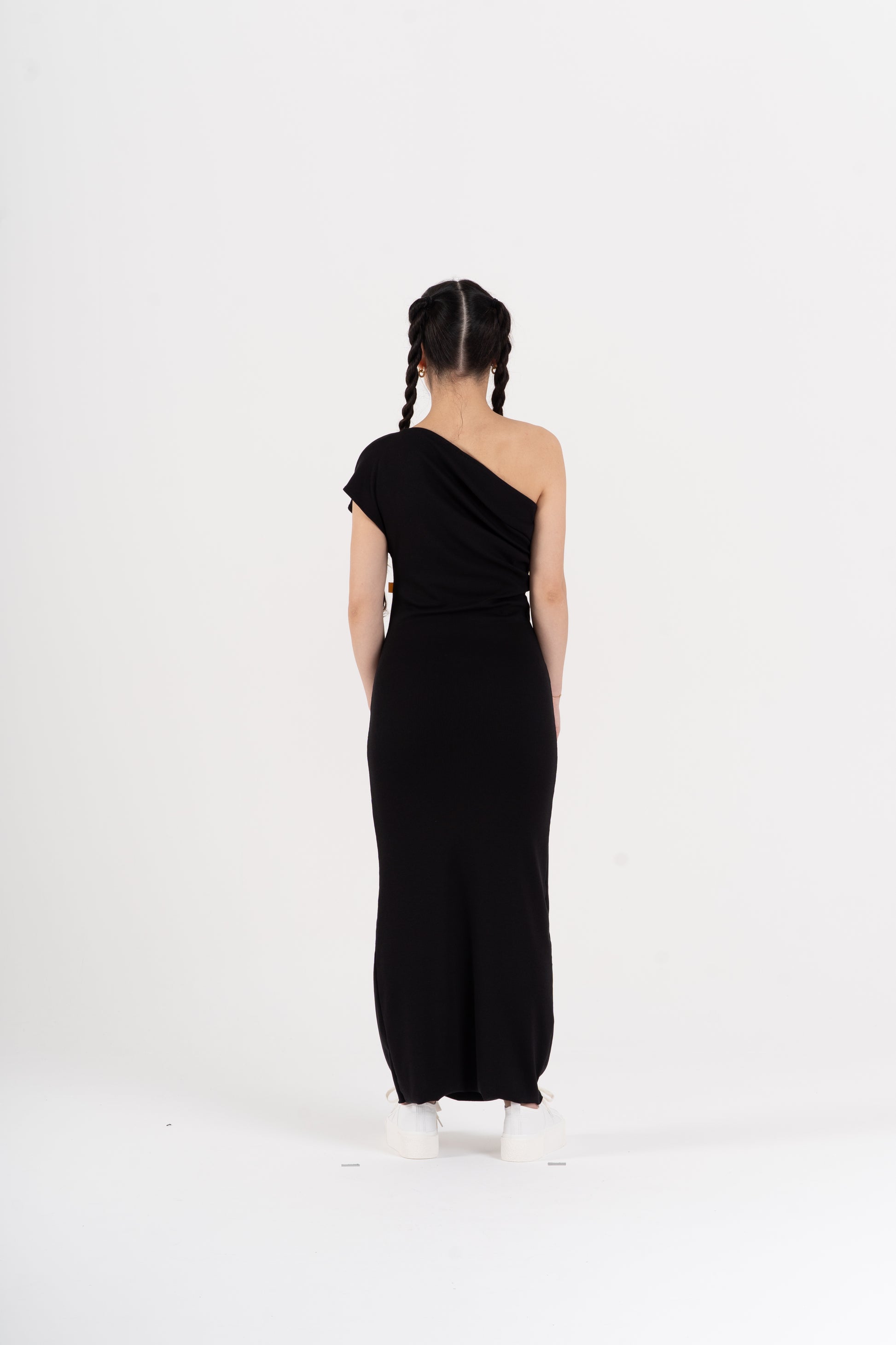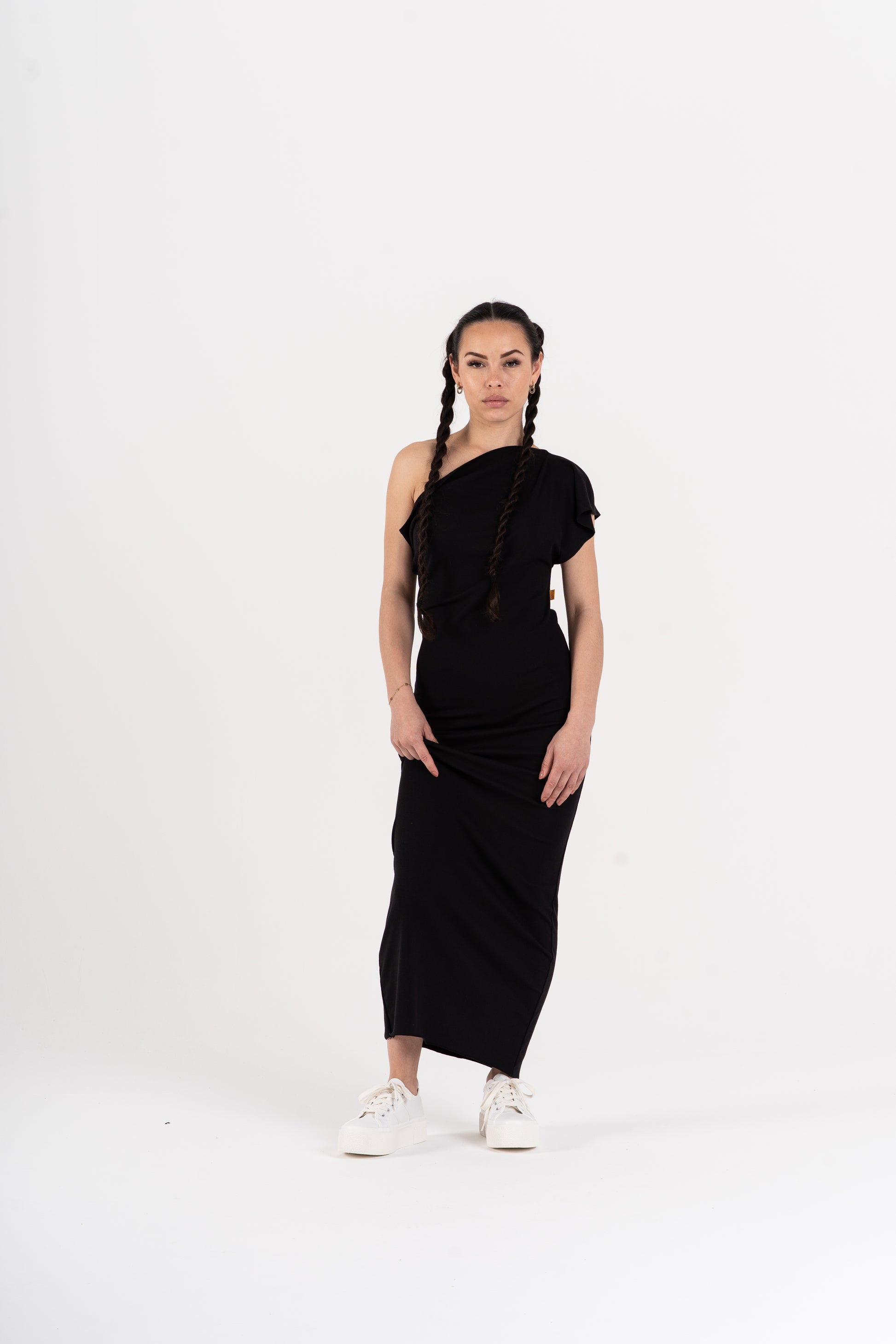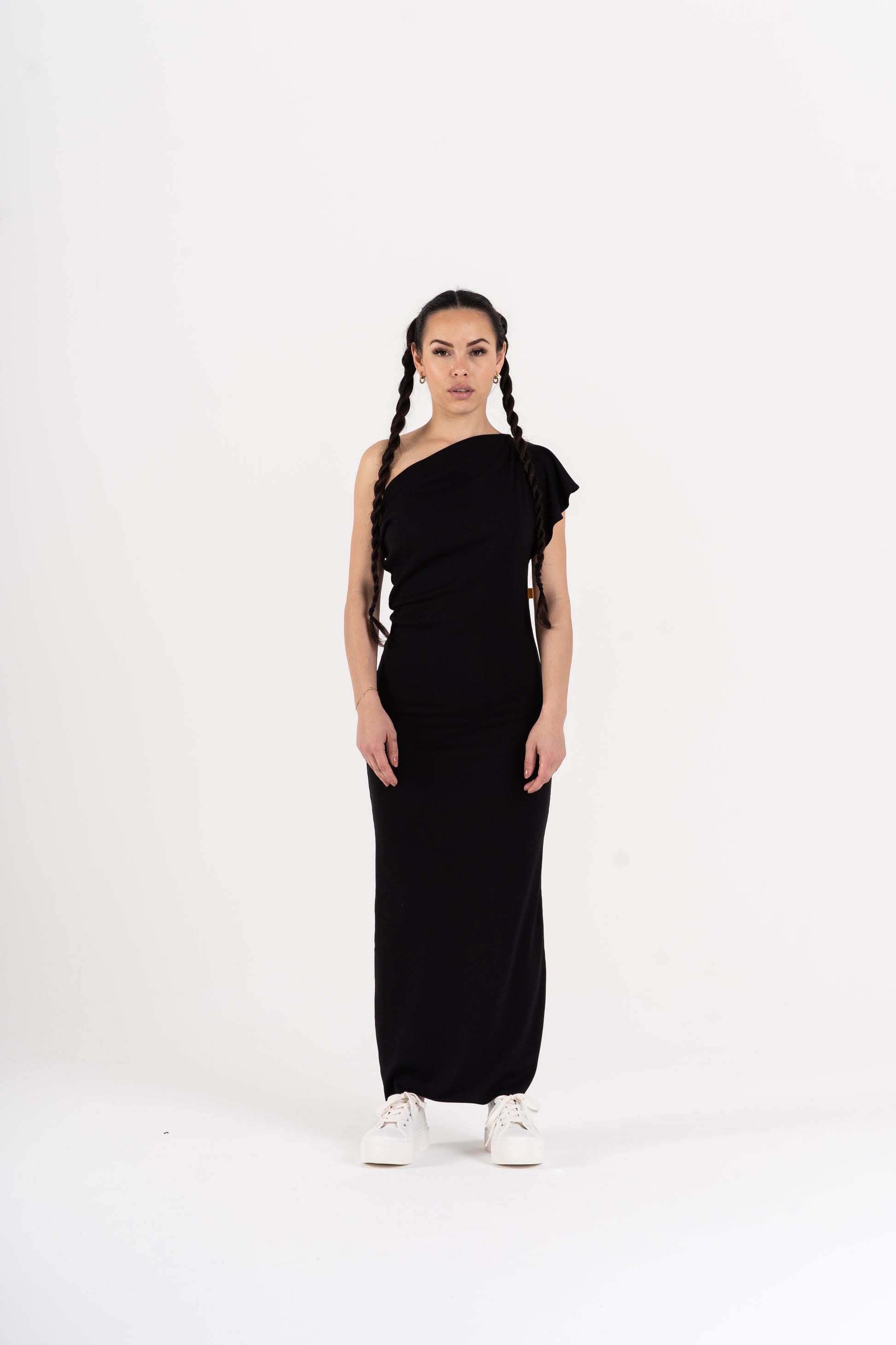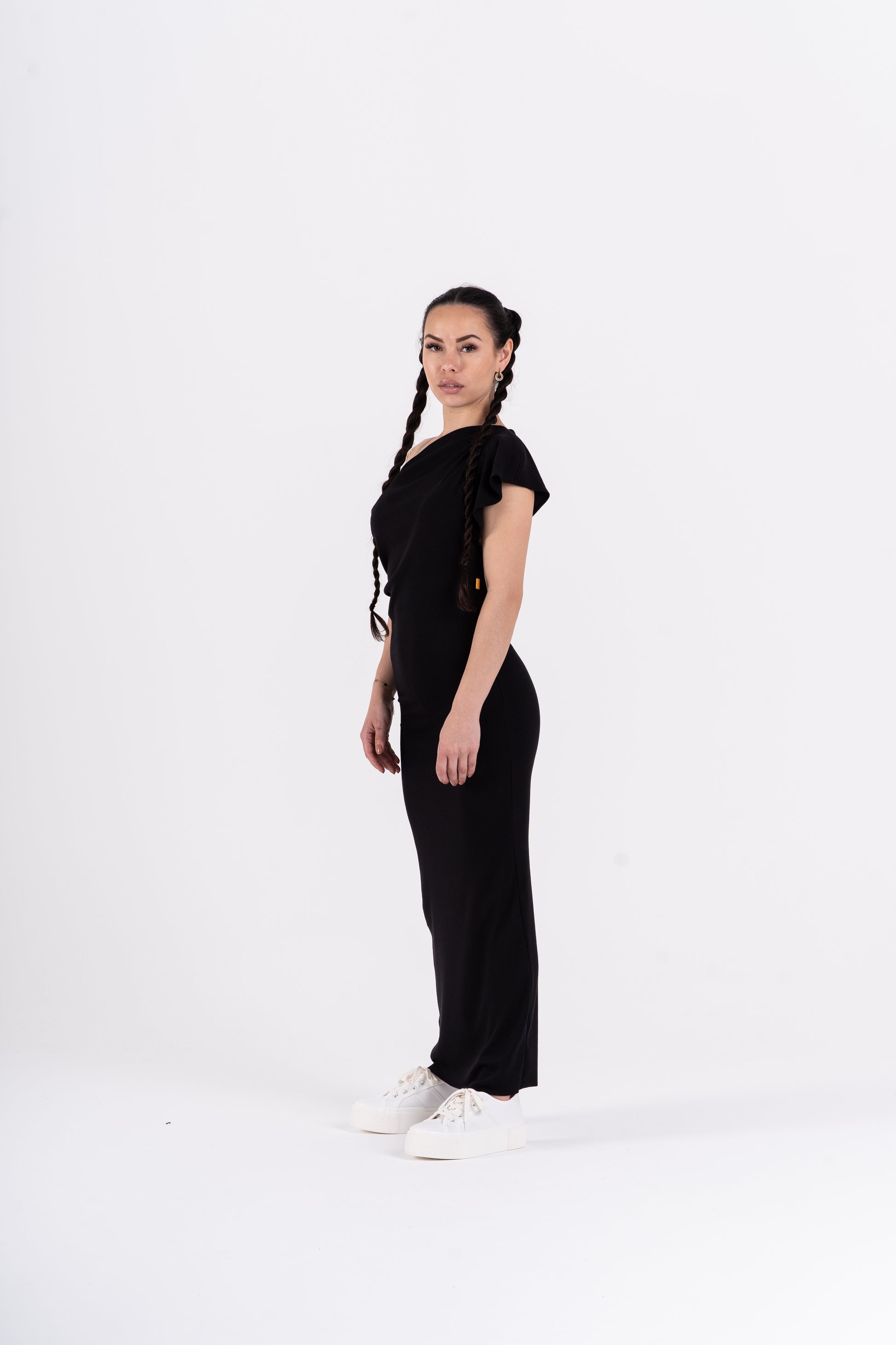 Jemně obepínají tělo, ale nechávají dýchat a díky žebru a elastanu jsou vhodné pro velikost S-L. Tyhle dlouhé šaty z pružného žebrovaného úpletu kopírují siluetu bez přehánění. Asymetrie jednoho ramene dodává nenucenou dramatičnost, zatímco černá barva drží věci při zemi – univerzální, silná, nadčasová.