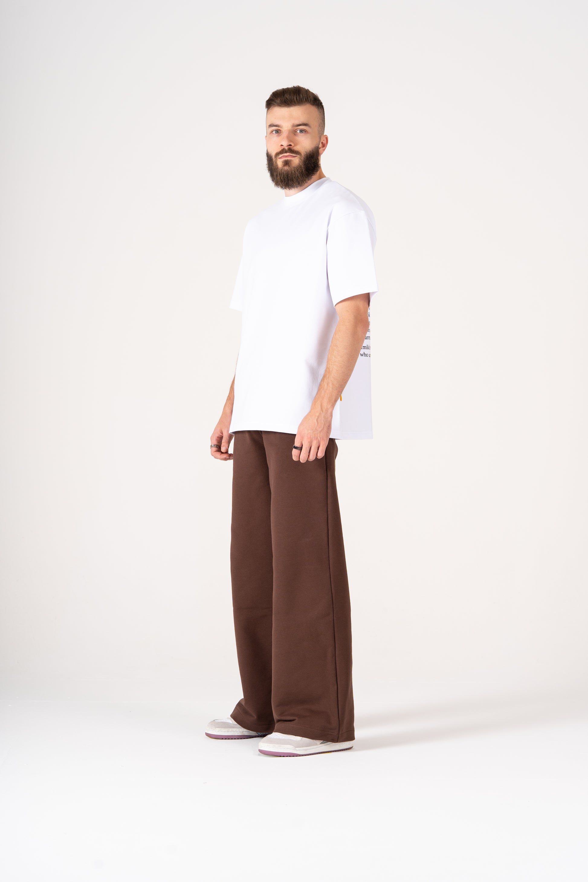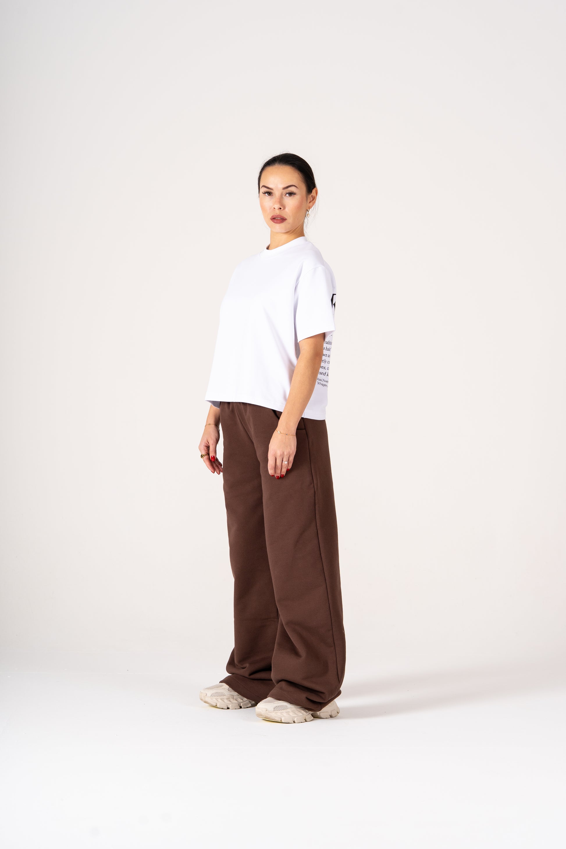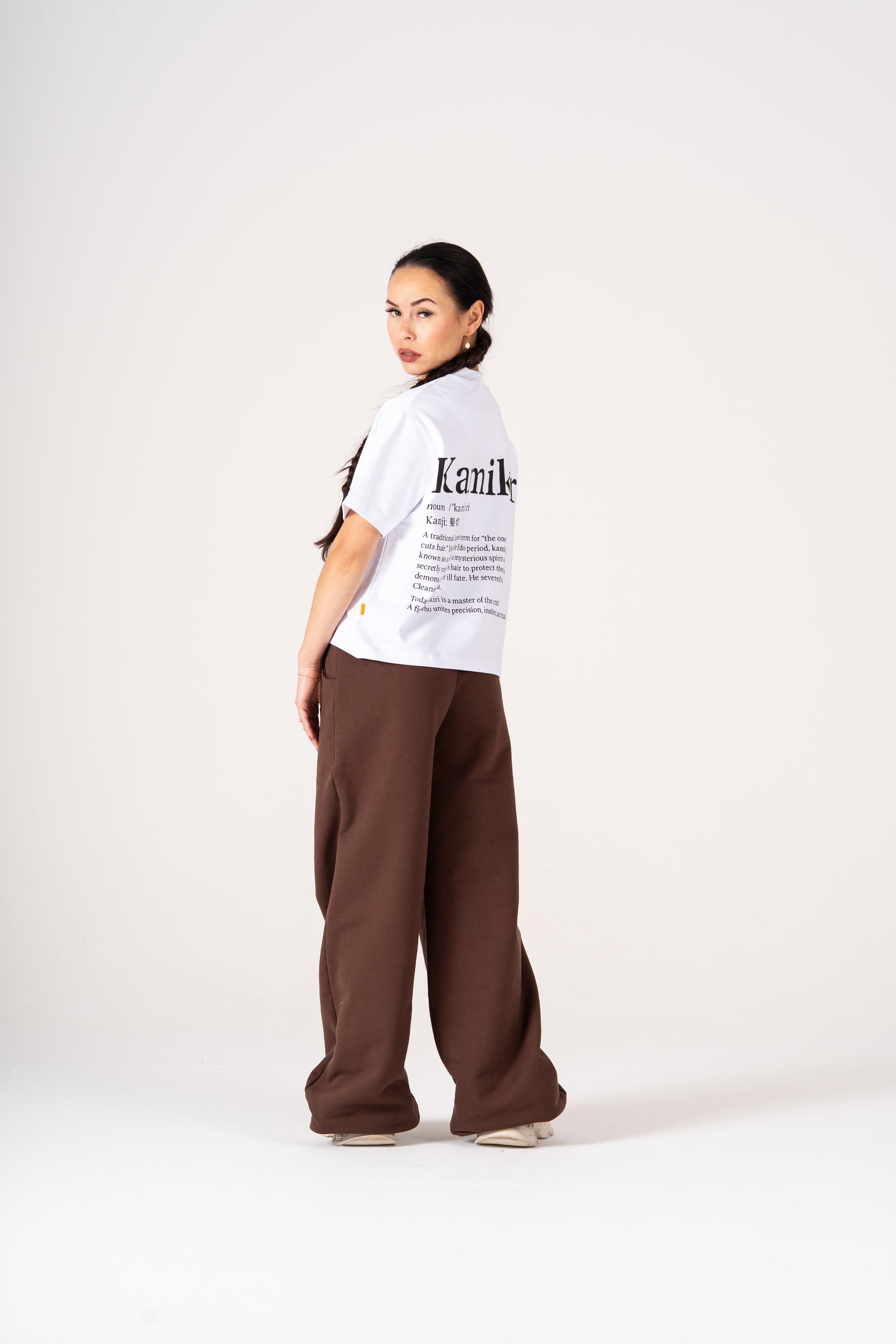 Boxy fit, bílé s výrazným potiskem na zádech. Oversize silueta funguje ke kalhotám i šortkám.